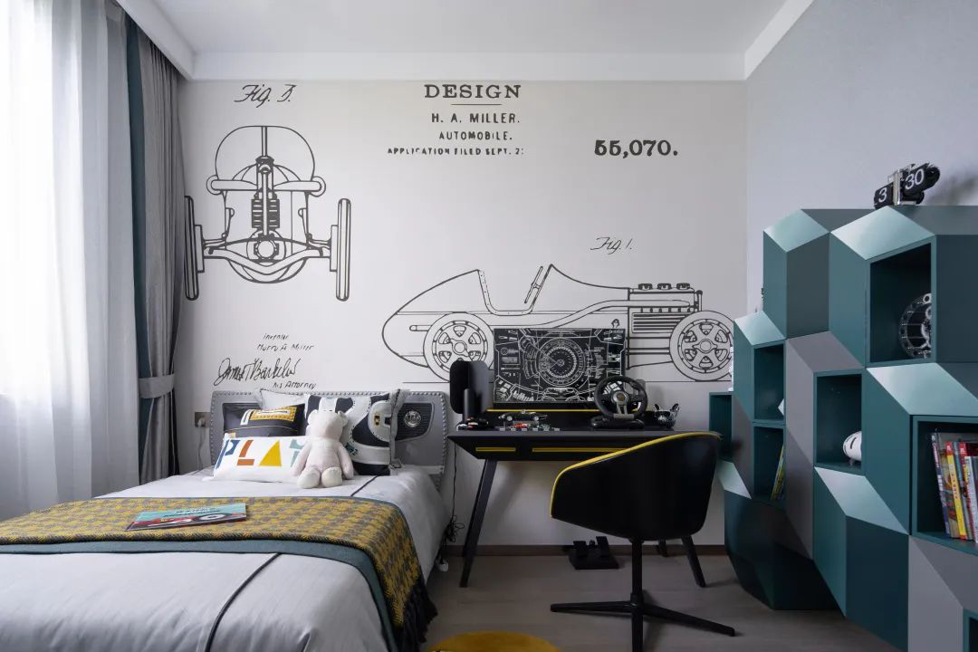 2、色调:首选纯正而鲜艳的颜色,墙壁的风格最好与别墅软装家具风格设计统一和谐,例如,给喜欢天文知识的孩子布置一个有太空感的房间,那么就不要选择暖色调的家具,如黄色或米色等,房间最好选用纯正而鲜艳的颜色作为主色调。